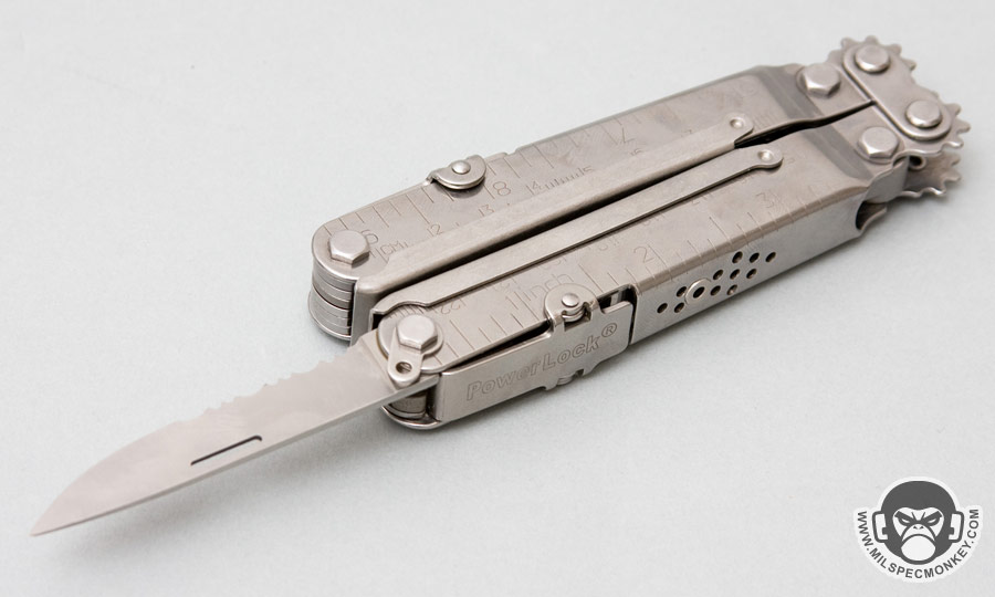 Treba napomenuti da se PowerLock neće zatvoriti dok svi alati na dršci nisu u potpunosti sklopljeni ili otklopljeni. Kako bi otvorili/otključali PowerLock, korisnik treba pritisnuti zadnji dio poluge koji se nalazi blizu sredine drške (piše na njoj PowerLock). Sada se alati mogu micati kako želite. Još jedan “meh” aspekt PowerLocka je izuzetno labava kočnica (PowerLock). Alati jesu zaključani u otvorenoj poziciji, ali bez obzira na to još uvijek se miču na dodir.