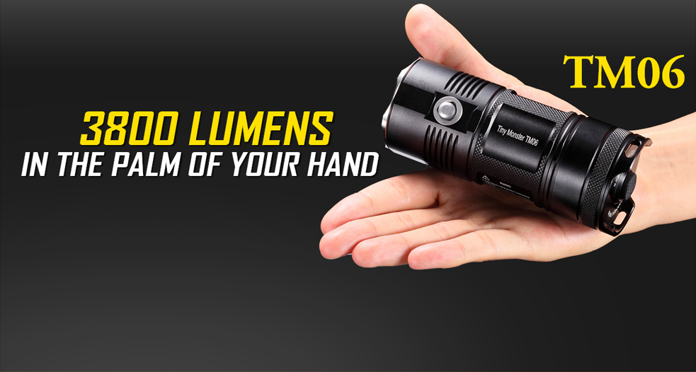 Nitecore je u svoju ponudu uvrstio ručnu svjetiljku svjetlosne snage 3800 lumena. TM06 nije baš malena svjetiljka, ali bez problema stane u ruku. Proizvođač poznat po inovacijama u industriji ručnih svjetiljki ovu snagu je dobio kombinirajući četiri CREE XM-L2(U2) emitera. Na boku svjetiljke je ugravirano Tiny Monster (malo čudovište) što dosta dobro opisuje ovu odnos veličine, mase i snage svjetla koje TM06 izbacuje. Izvor energije za ovo čudovište su četiri 18650 punjive baterije i to je jedina vrsta baterija s kojom je ova svjetiljka kompatibilna. Nije moguće, kao što je to slučaj s većinom ručnim svjetiljki koje primaju 18650 baterije, u stisci iskoristiti dvostruko veći broj CR123 baterija.